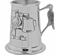 The birth of a new child is a wondrous and joyful occasion and this beautiful pewter child's cup is an elegant and stylish way to commemorate a birth, and is also a wonderful gift for new parents. The 8.5cm by 5cm tankard is decorated with an intricate image that includes two storks, a clock face onto which the time of birth can be added and engraving scrolls with the words 'Name' , 'Date' and 'Weight' onto which the relevant information can be added to make the item truly personal. An extra special touch is then added in the shape of the beautiful handle which is specially designed as a stork to herald the new birth. Composed of high quality pewter the tankard can be kept as a memento of the happy occasion for years to come in its stylish cream and black presentation box.