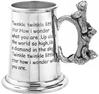 A truly traditional and all-around beautiful christening gift, the BG80 pewter child's tankard is a wonderful way to show a new addition to yours or a friend's family just how much you love them. The straight sided 8.5cm by 5cm tankard is cheerfully decorated to the front by an image of the moon and two children, with the text 'twinkle twinkle little star', whilst the reverse includes the text 'Twinkle twinkle little star how I wonder what you are. Up above the clouds so high like a diamond in the sky. Twinkle twinkle little star how I wonder what you are.' . The wonderfully jolly tankard is then completed by a handle which features three climbing teddy bears before the tankard is then packaged in a gorgeous cream and black presentation box.