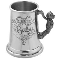 For many years it has been traditional on the occasion of a christening for a child's family and friends to give commemorative gifts such as spoons or tankards, and this wonderful pewter Child's tankard allows you to continue this tradition in real style. The body of the tankard is wonderfully adorned with a heart shaped ribbon design that features flowers at the bottom of the heart and the text 'Baby' within a stylised scroll. This design can be supplemented by your own choice of engraving to make the gift truly unique and even more personal. The 8.5cm by 5cm child's tankard will not tarnish over time and is supplied beautifully packaged in an elegant cream and black presentation box.